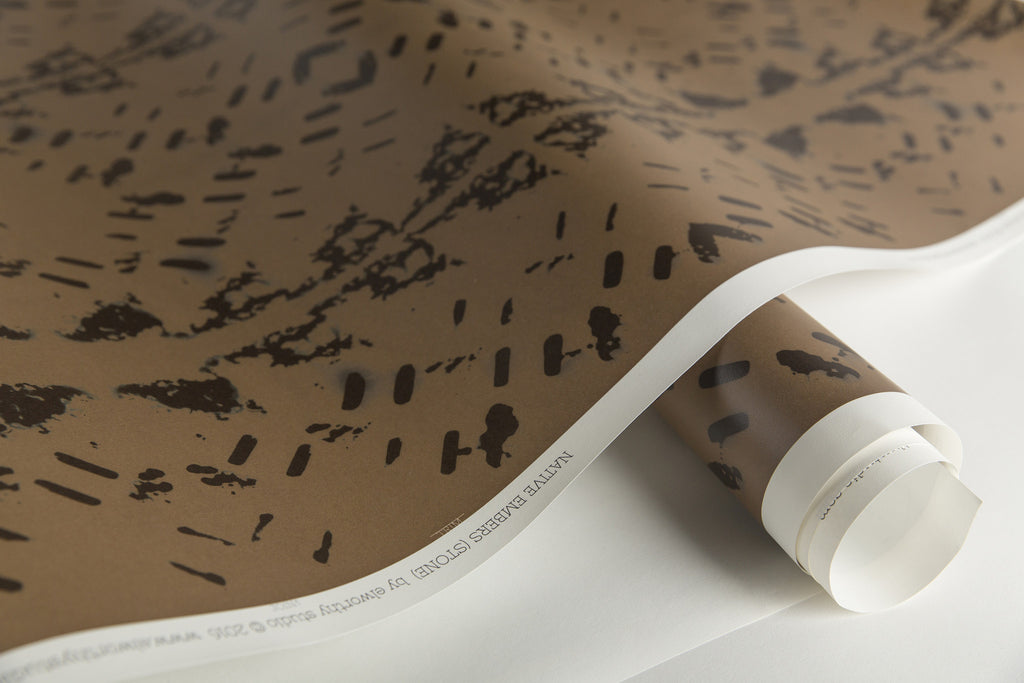 Native Embers presents a series of primitive characters whose indistinct, smudged edges have a charred or smoldering quality. Part of the Clair Obscur collection, this design is available in five colorways: Black, Silver, Bleached Rose, Stone and Petrol.