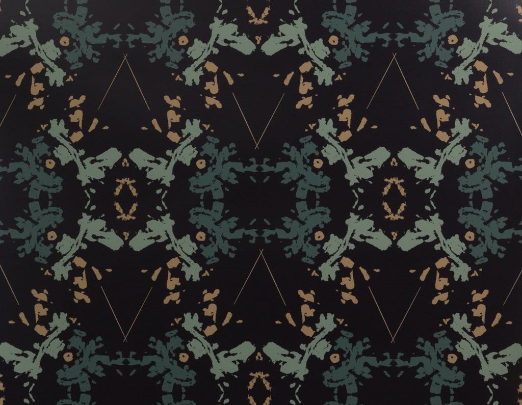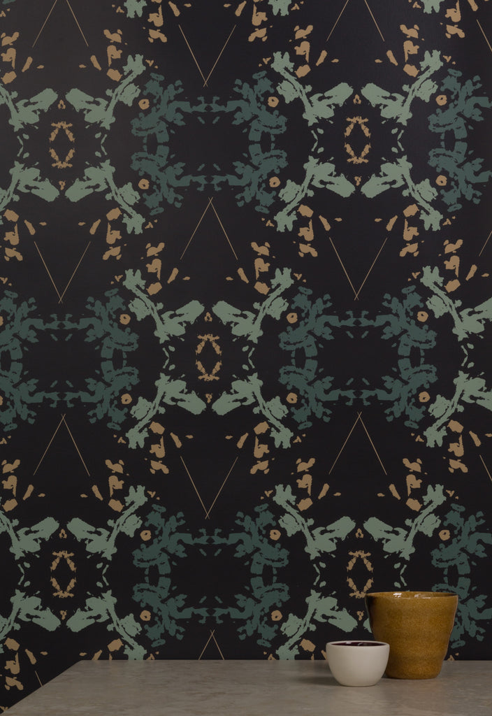 Dark graphite serves as backdrop to bold textural markings in teal, sage, and tan. The bright markings imbue the moody background with a sense of energy, while ultra thin hand-drawn lines add a hint of delicacy. Part of the Decay Collection, this wallpaper design features unique shapes made with imprints of rusted objects. Blackish Magic was created with impressions of the face of a vintage metal doorknob.