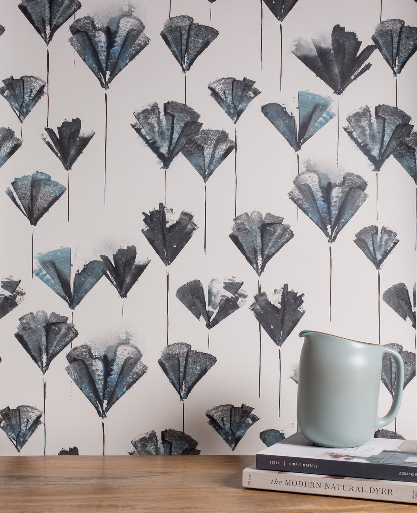 The artist designed the painterly, abstract Botanica with the California poppy in mind. She created a series of floral motifs by dipping an art blade in ink, then creating layered petals with one hand and spraying water onto the paper with the other. The ink and water interact differently each time, capturing a unique expression of movement and fluidity in each motif.