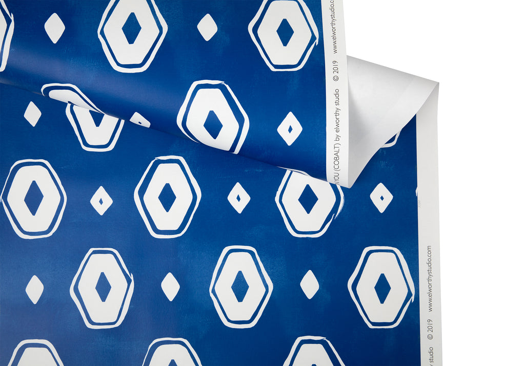 Hex on You wallpaper is available in two colorways : Cobalt and Clay. This design is printed on luxe vellum paper, which is a heavier weight and offers a matte finish.