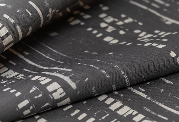 Traces is inspired by fragments of seashells designer Kate Miller found during one of her walks on the beach. She used printmaking methods to capture the beauty of a seashell's lifecycle. This design reads as a vertical stripe, full of movement and organic texture.