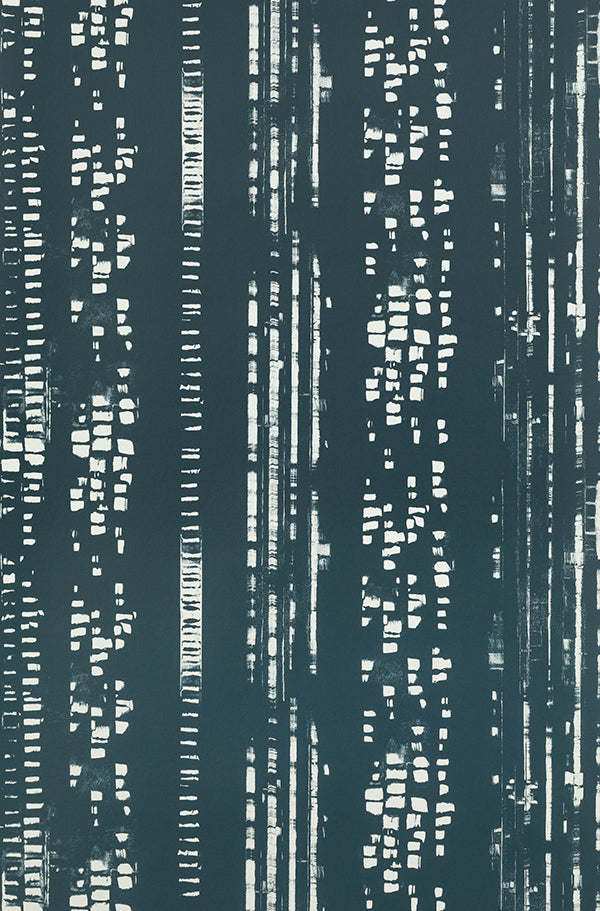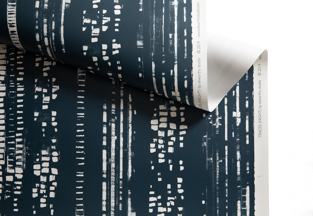 Traces wallpaper is available in two colorways, Earth and Night.  Night features a rich indigo background with white markings.  Both Earth and Night are printed on luxe vellum paper, which is a heavier weight and offers a matte finish.