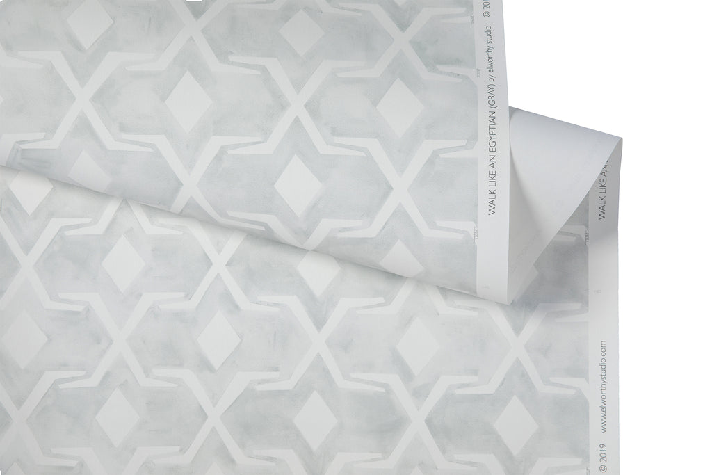 Walk Like an Egyptian wallpaper is available in two colorways, Gray and Sky. This design is printed on luxe vellum paper, which is a heavier weight and offers a matte finish.