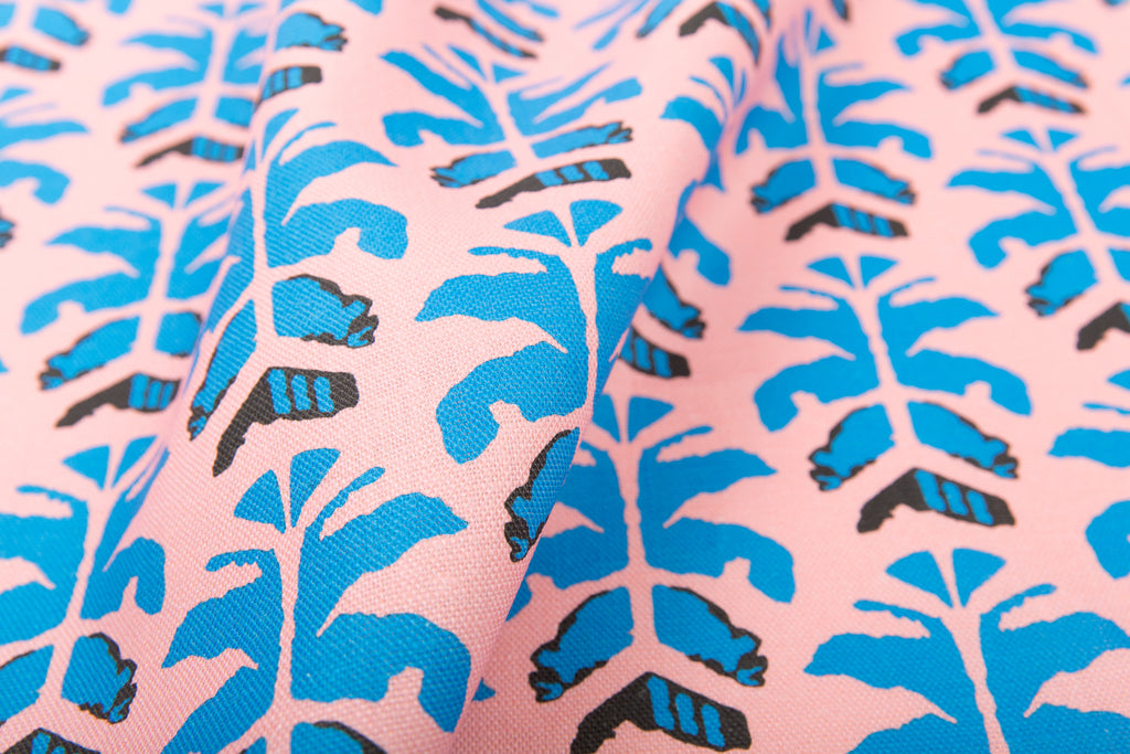 Wild Palms is available in four colorways- Lovina, Sahara, Rio, and La Boca. Named for the colorful Buenos Aires neighborhood, La Boca features a bright pink background with cerulean palms and black accents, printed on heavyweight oyster linen.