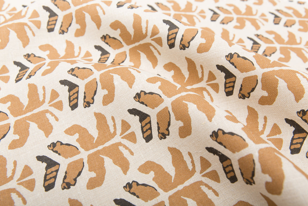 Wild Palms is available in four colorways- Lovina, Sahara, Rio, and La Boca. Named for its neutral desert hues, Sahara features a flax background with camel-hued palms and charcoal accents, printed on heavyweight natural linen.