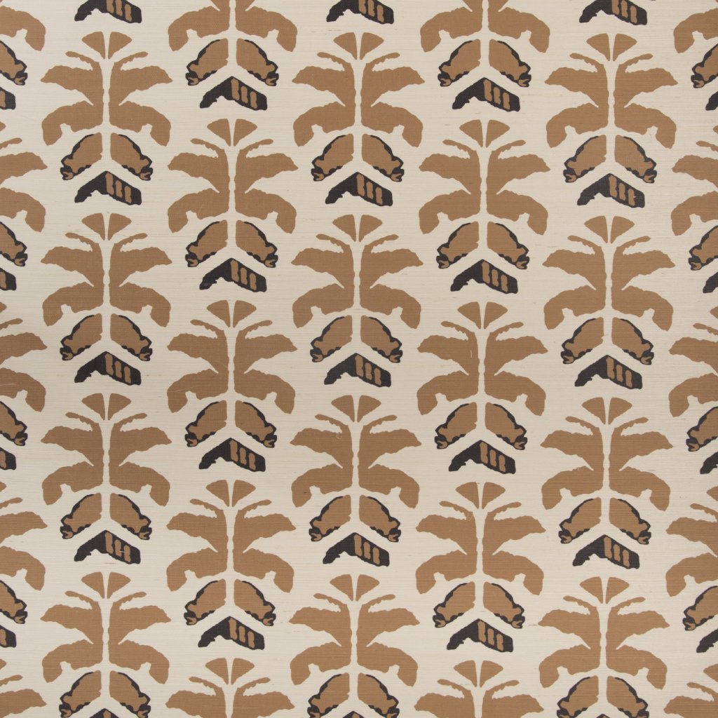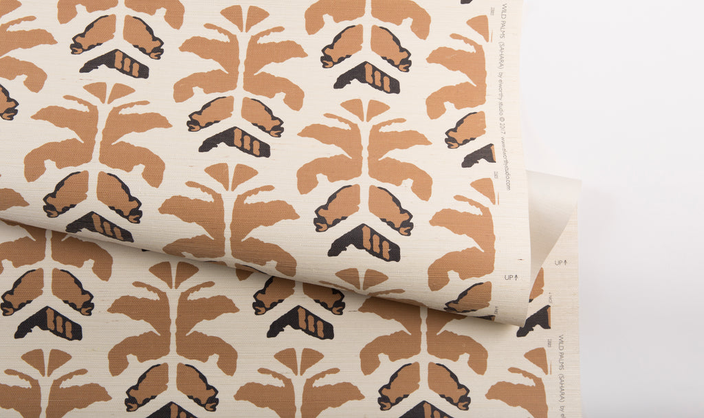 Wild Palms Grasscloth is available in two colorways- Lovina and Sahara. Named for its neutral desert hues, Sahara features a flax background with camel-hued palms and charcoal accents, printed on woven sisal grasscloth.