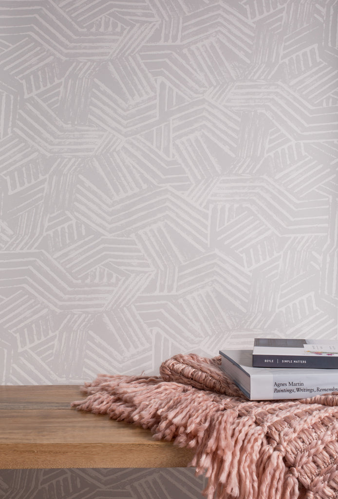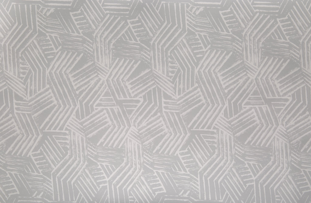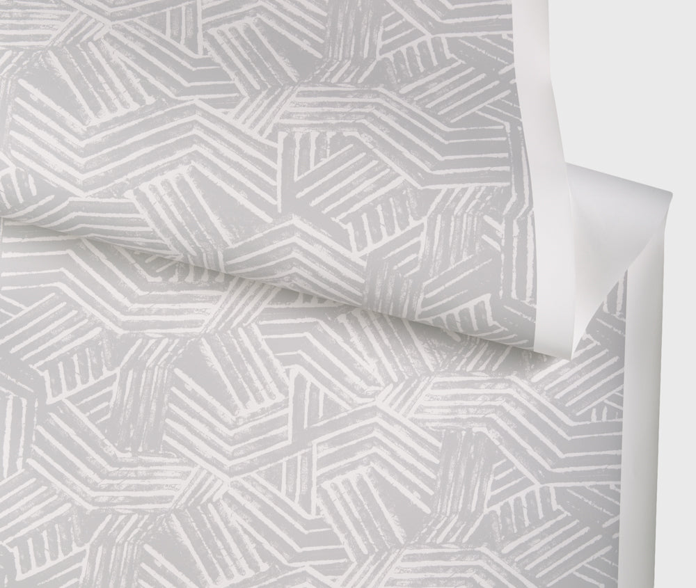 The angular, intersecting lines of labyrinthine Miramar were inspired by sunlight shining through fences on the beach. The design is adapted from the ghost print of a monotype, which resulted in rich background texture paired with soft lines that look spray painted.